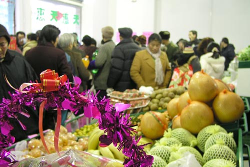 xinnianyishi,tianhuichaoshixufenglibianmindiankaiyele。suiranshixingqitian,danyidazaojiuyoufujindejuminlaicidenghou,tamenzaoyipanwangnenggouyouyijiatianhuidiangeitamentigongzhiyoujialiandexinxianshucai、豬肉等商品。小小的店堂不一會就被擠得滿滿當當。顧客們表示,要是店麵再大一點就更好了。